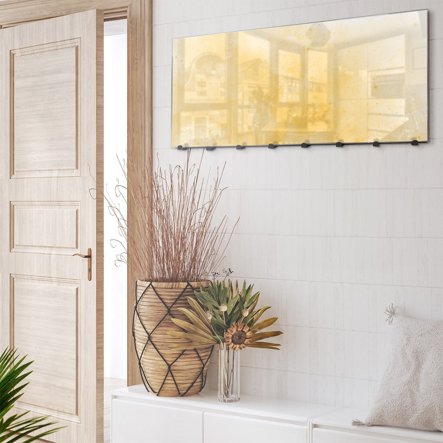 Unsere Wandgarderobe aus Glas ist mehr als nur ein Ort, um Jacken und Taschen aufzuhängen. Dank der magnetischen Funktion kannst du ganz einfach Notizen oder Dekorationen mit Magneten befestigen. Außerdem ist die Glasoberfläche beschreibbar mit Whiteboard-Markern, sodass du die Wandgarderobe auch für Erinnerungen oder Einkaufslisten verwenden kannst. Dies macht die Wandgarderobe zu einem praktischen und vielseitigen Gegenstand für jeden Raum.