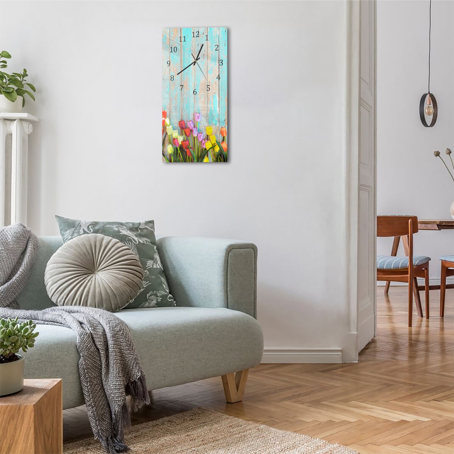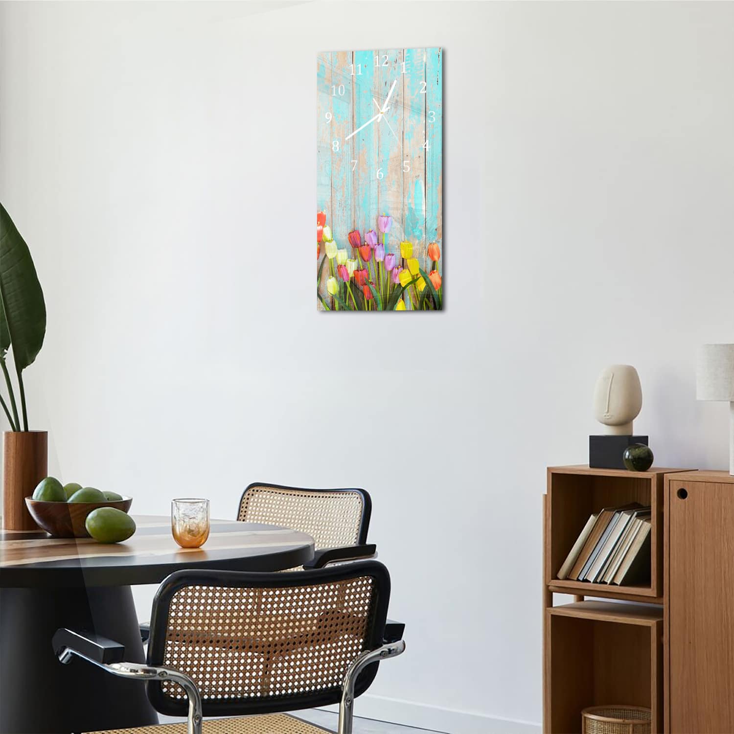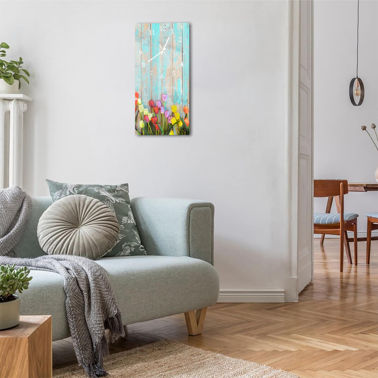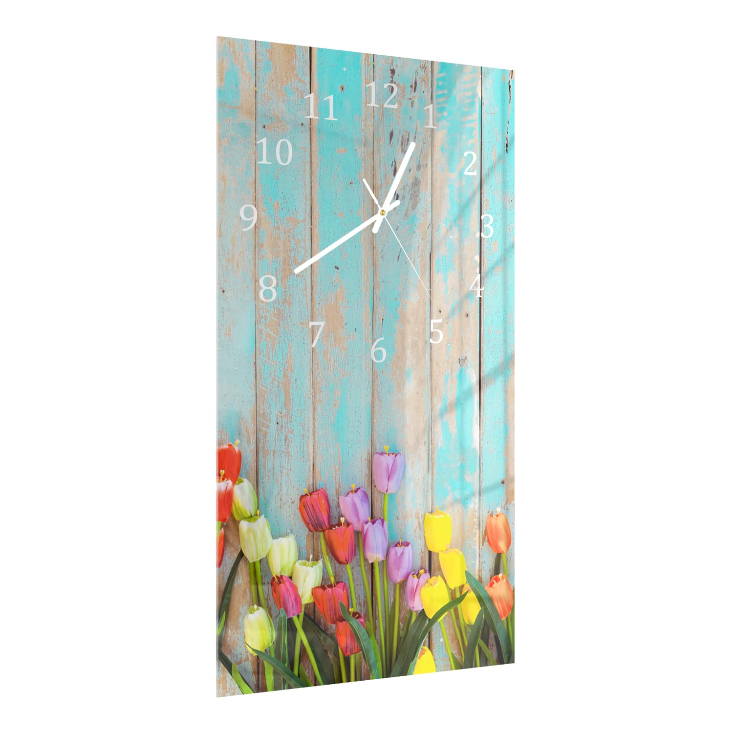 Wanduhr 30x60 - Tulpen vor Vintage-Holz