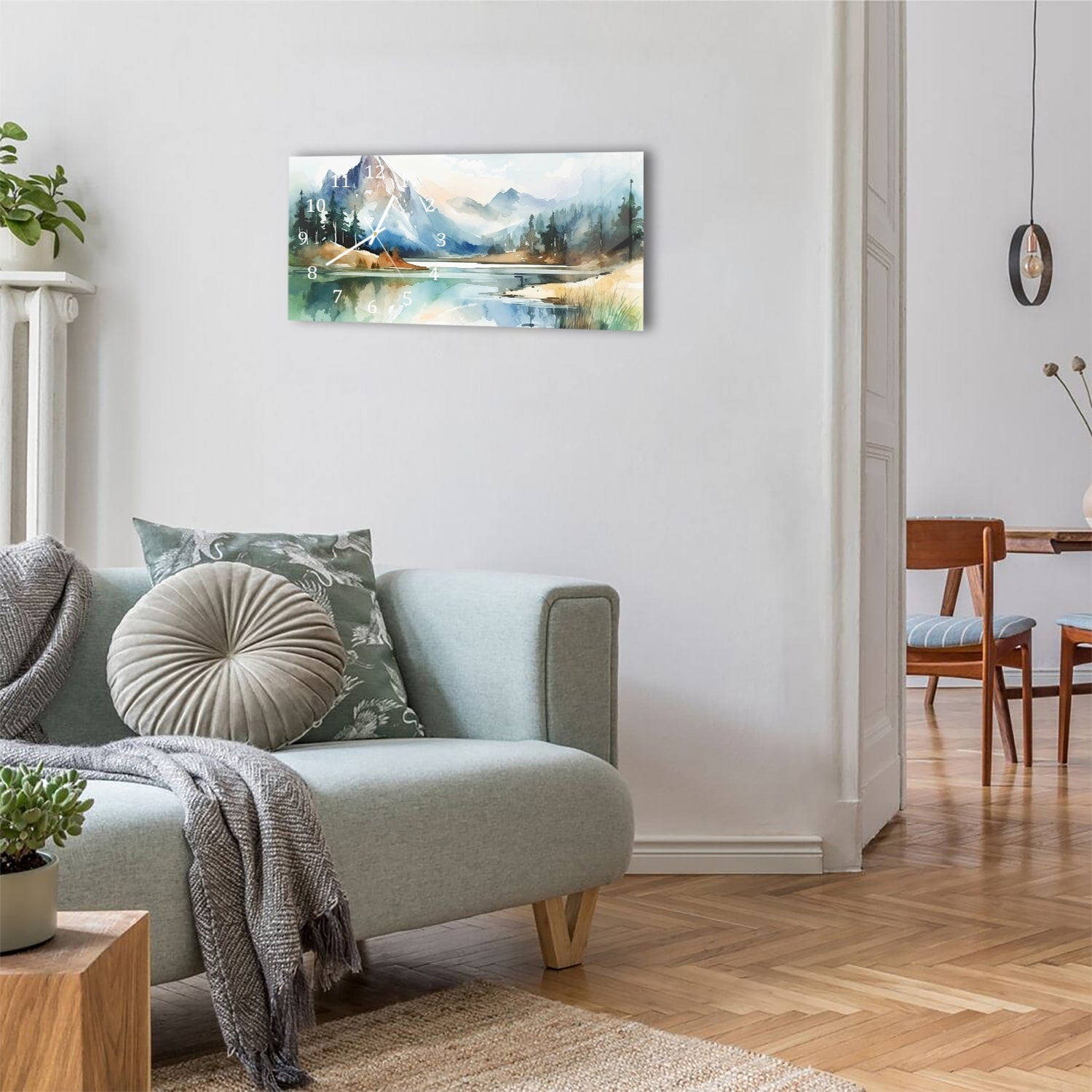 Wanduhr 60x30 - Aquarell-Landschaftsgemälde mit Bergen
