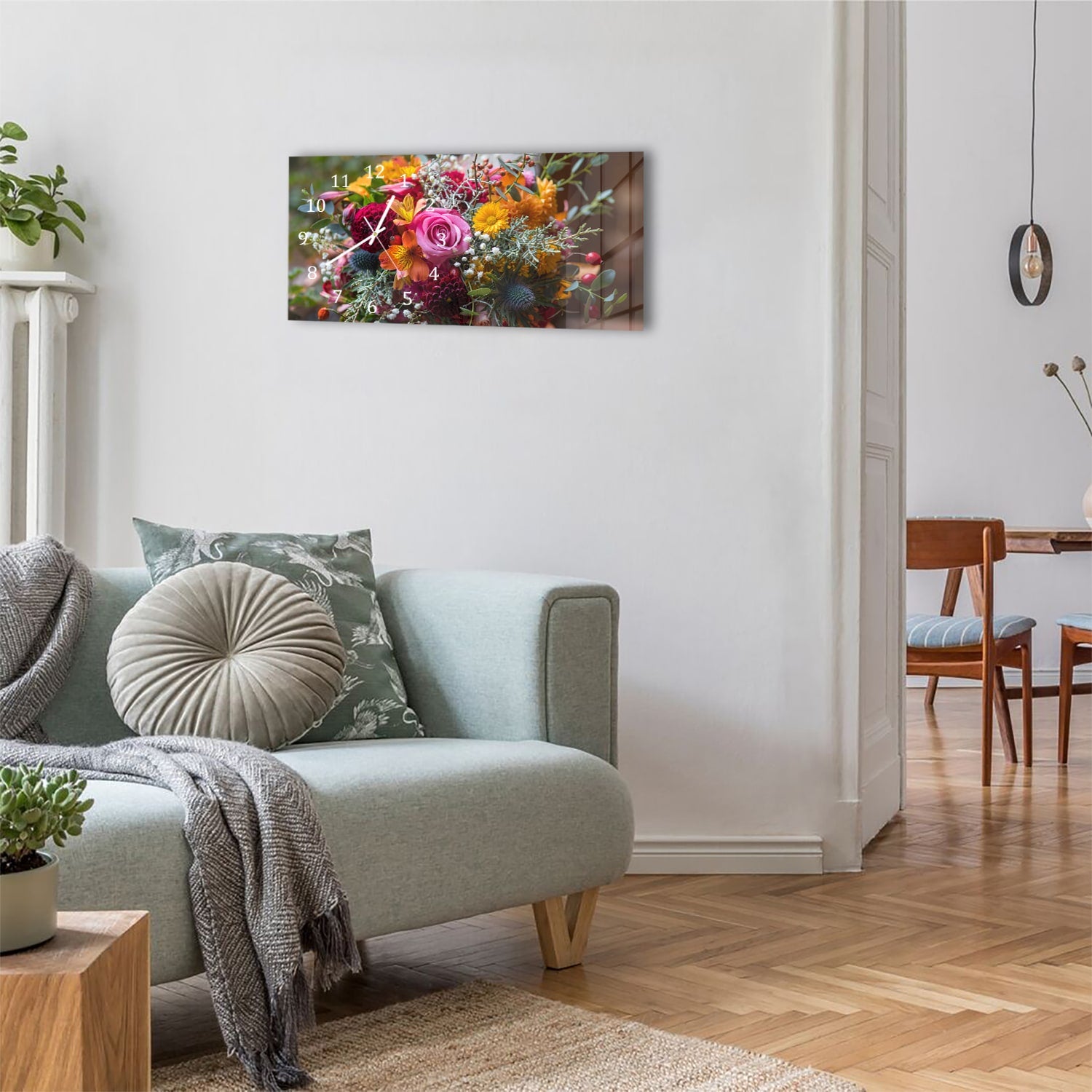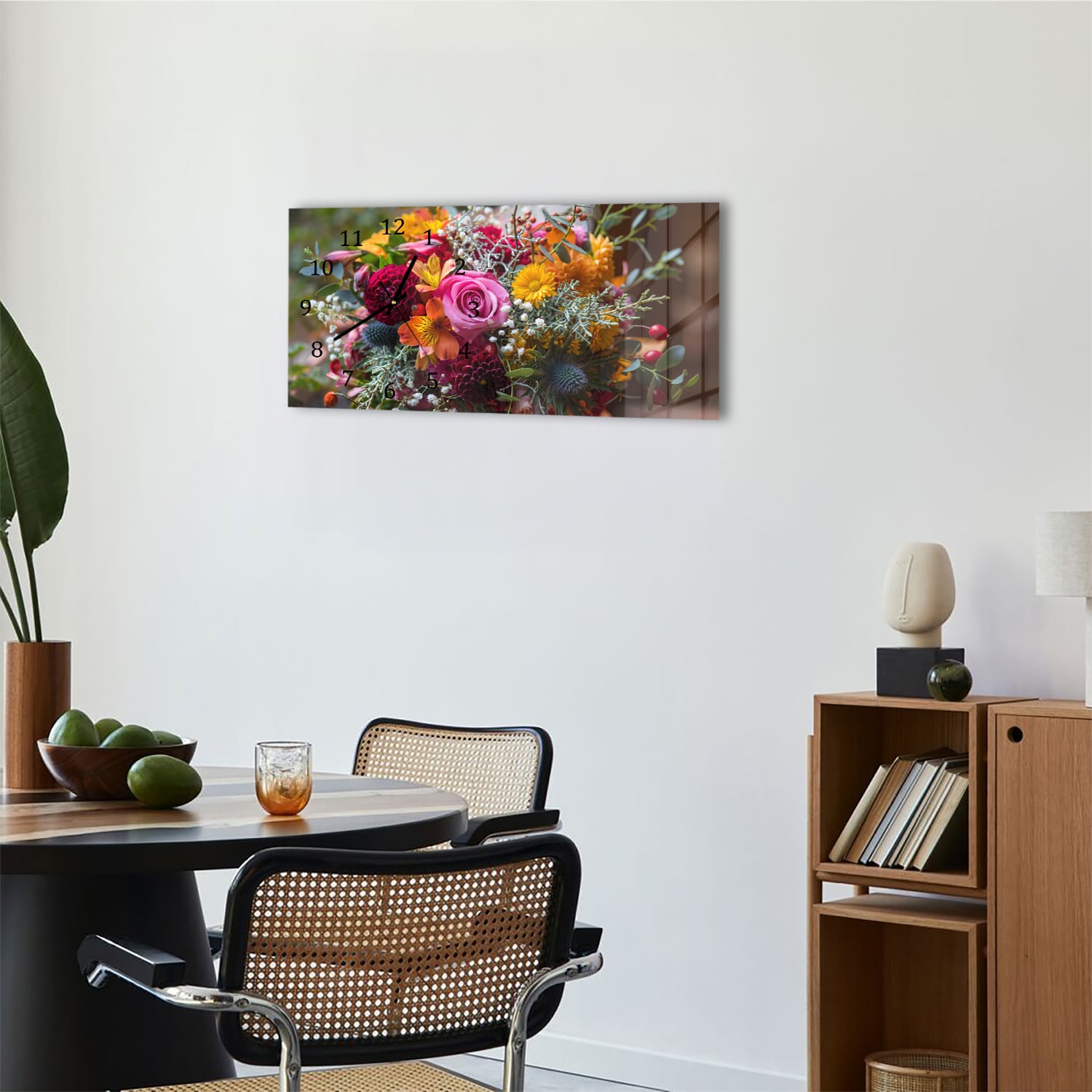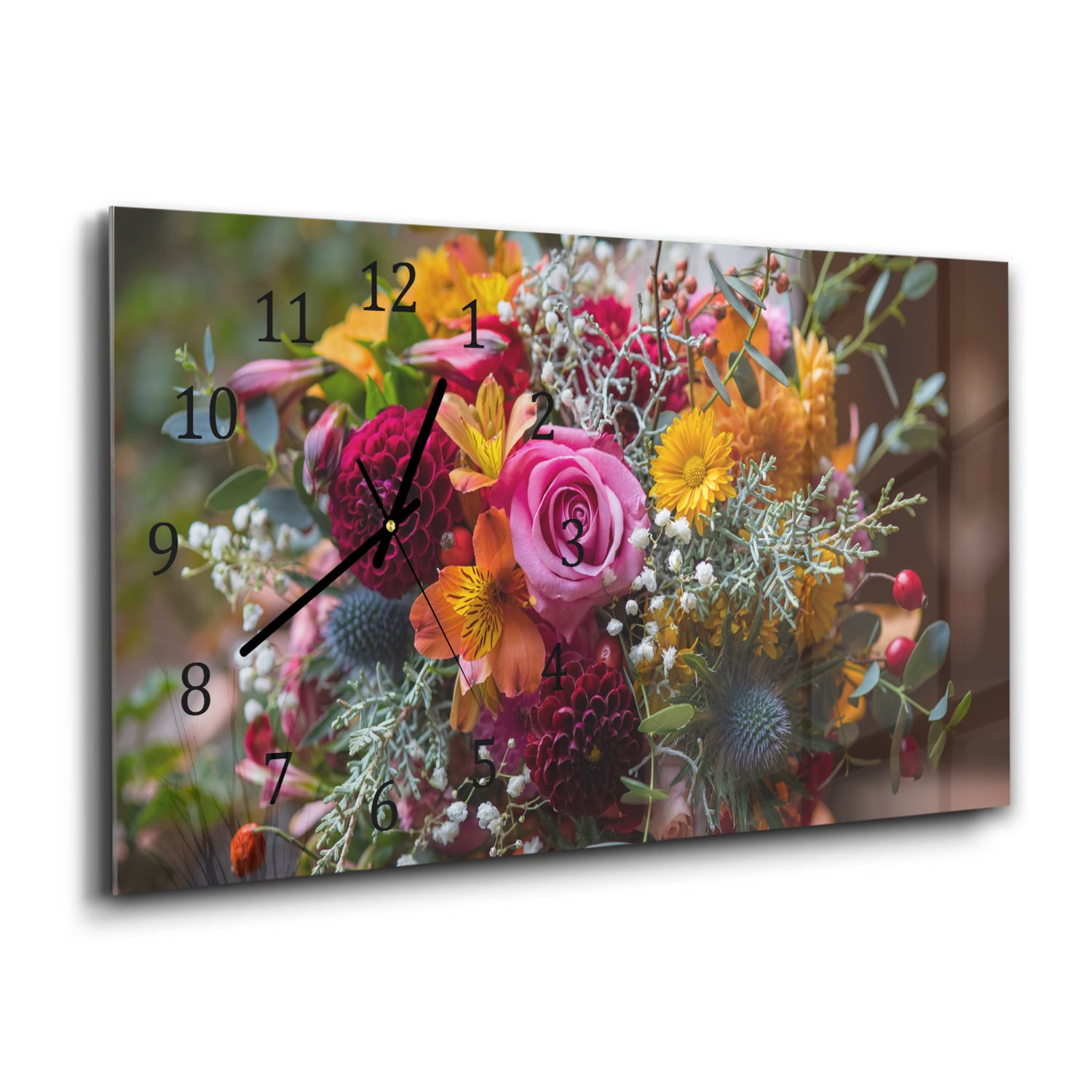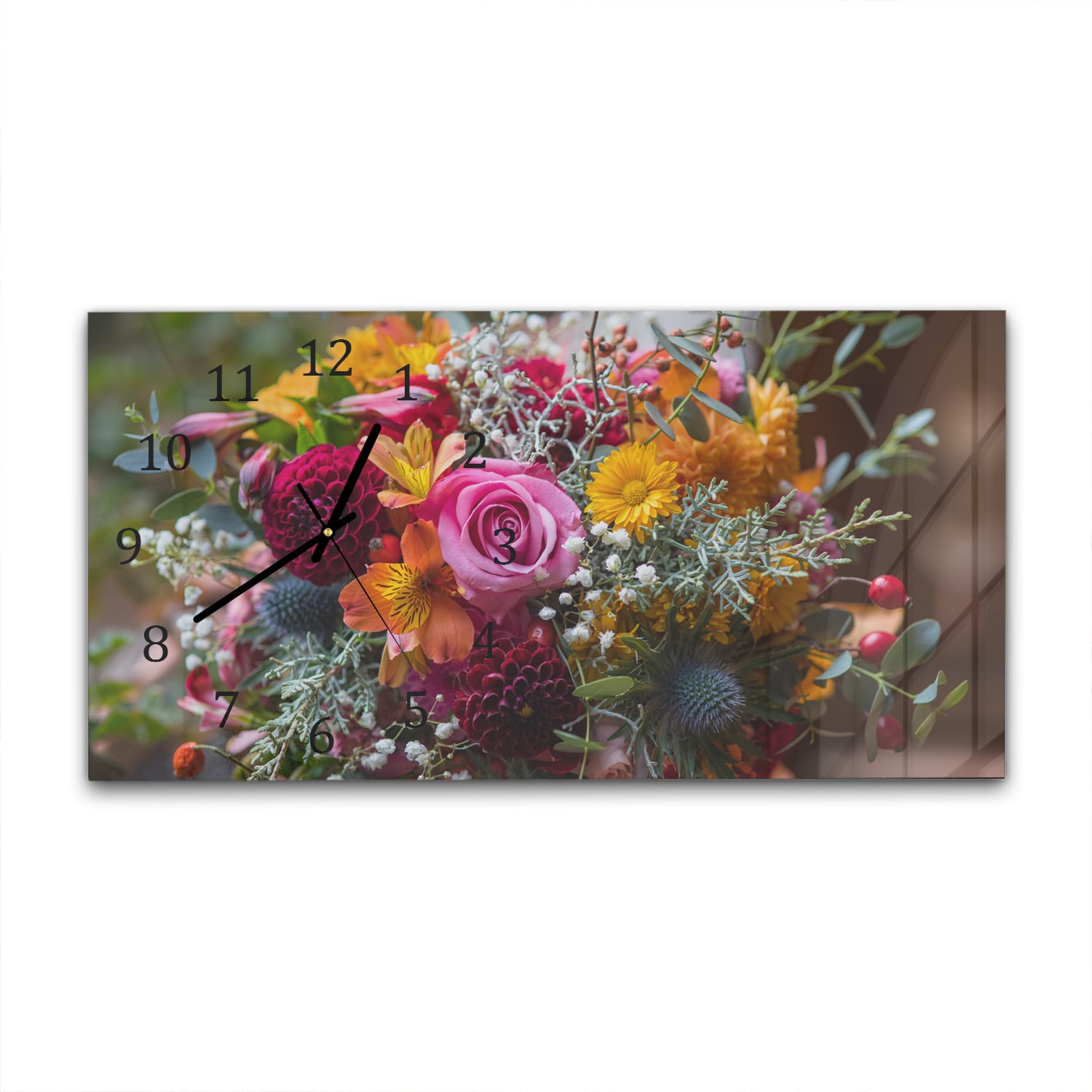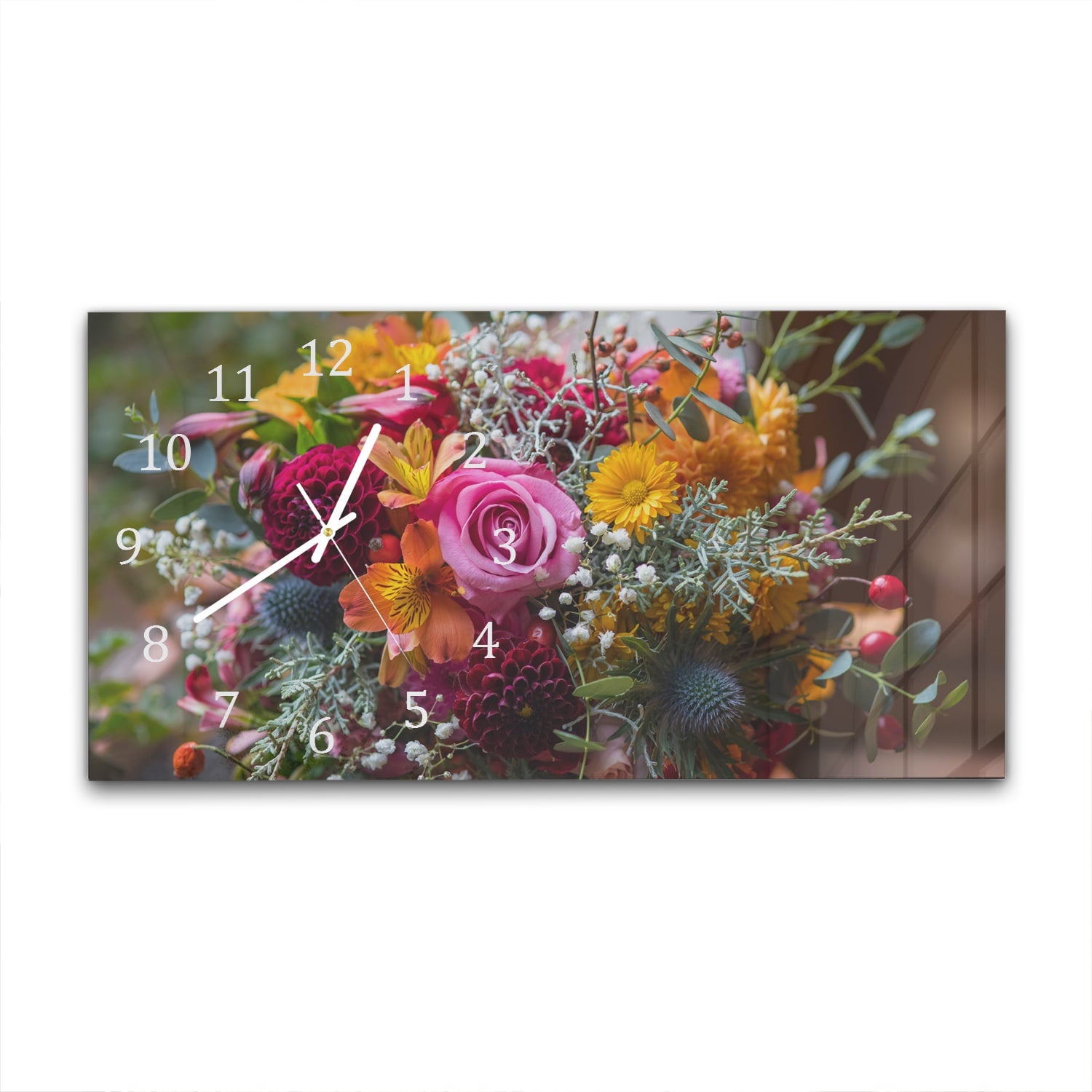 Wanduhr 60x30 - Bunter Blumenstrauß