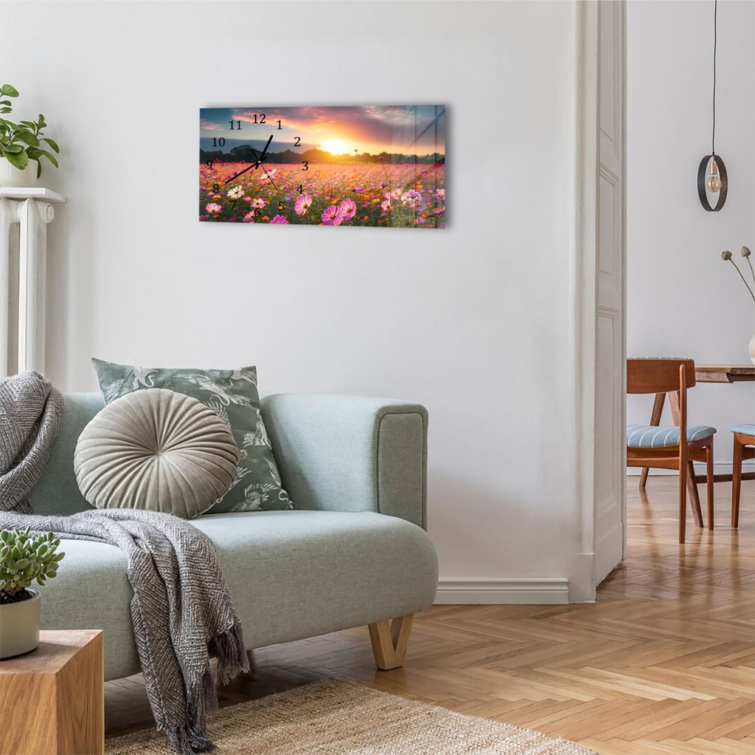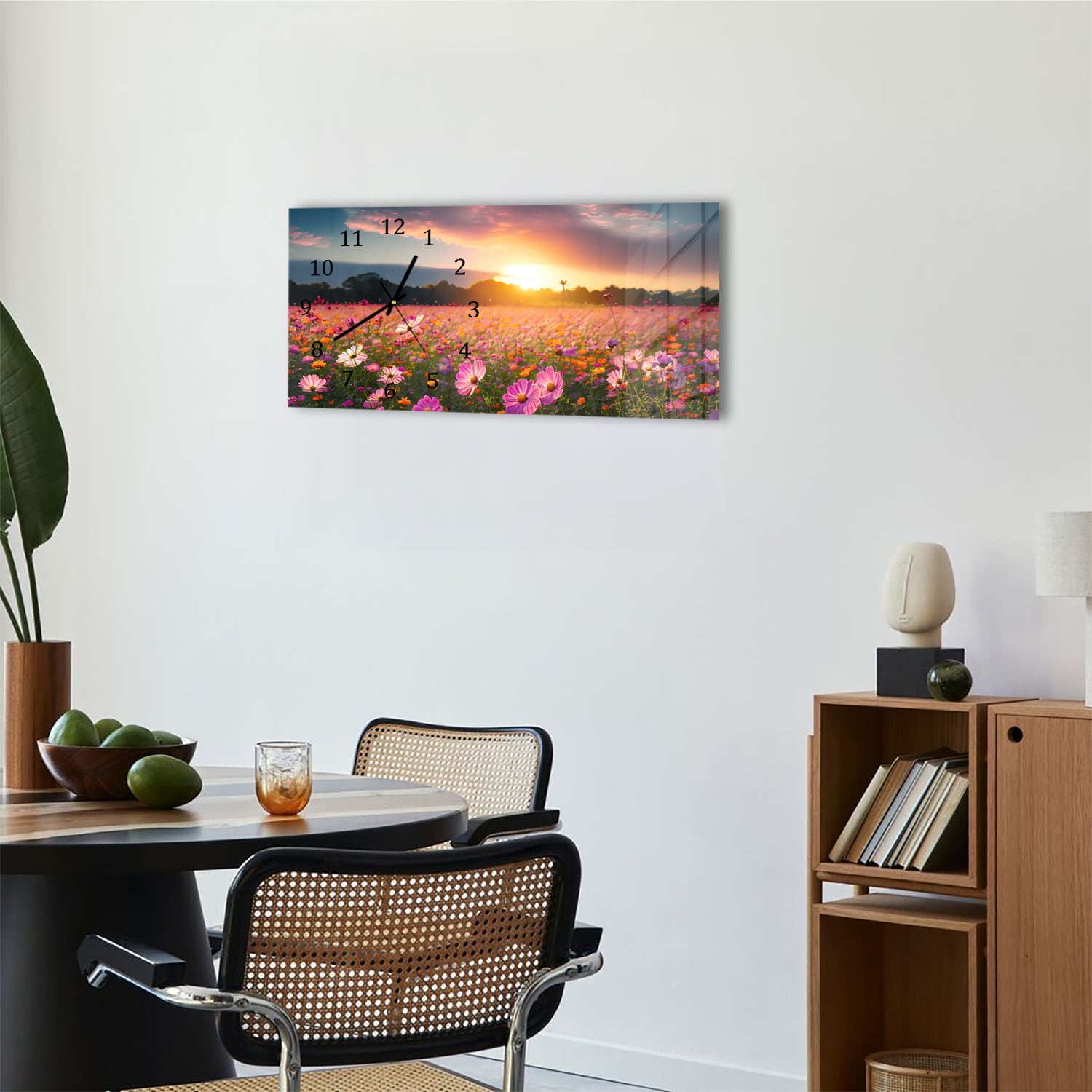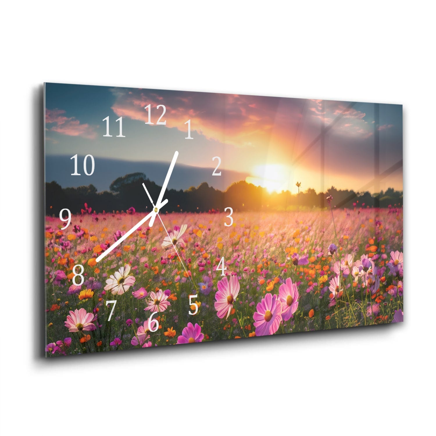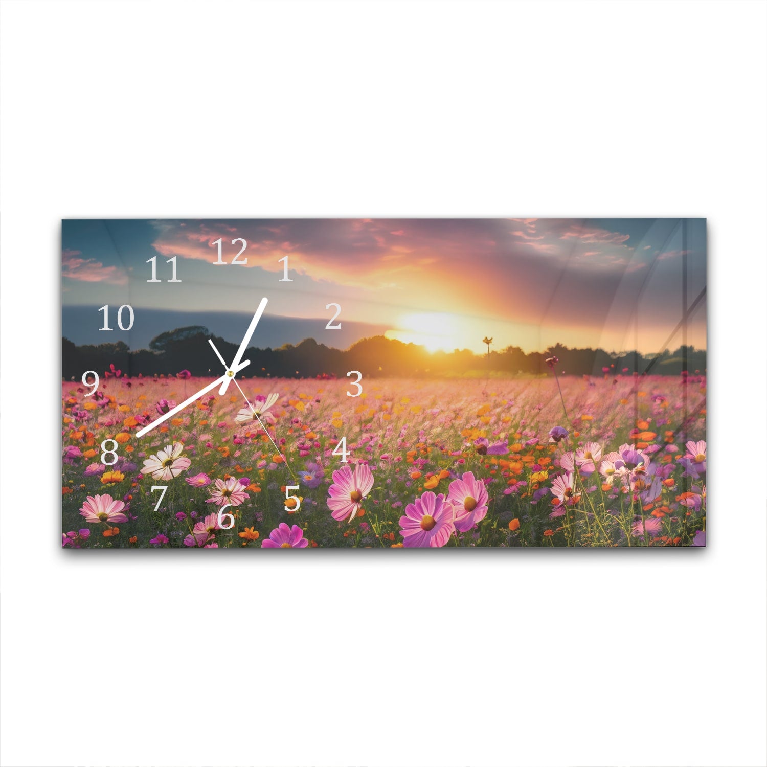 Wanduhr 60x30 - Sommerblumen bei Sonnenuntergang